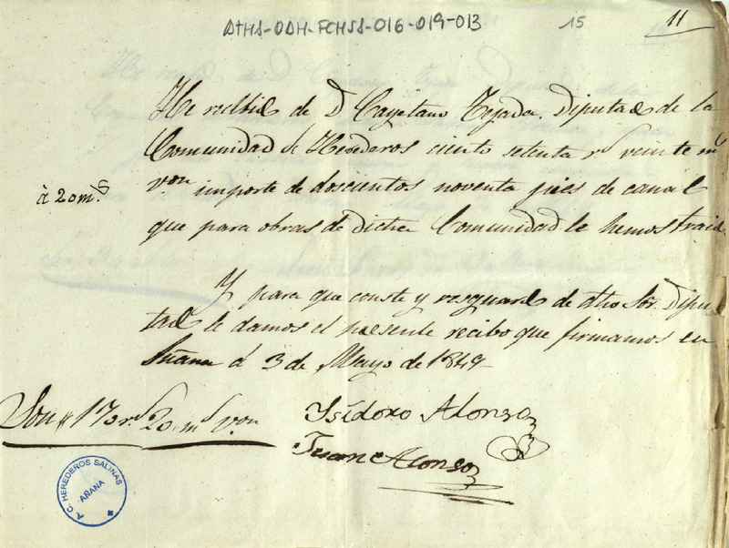 Recibo de 170 reales y 20 maravedíes otorgado por Juan e Isidoro Alonso, en favor de Cayetano de Tejada como Diputado de la Comunidad de Herederos de las salinas de Añana, por el suministro de 290 pies de canal a la expresada Comunidad