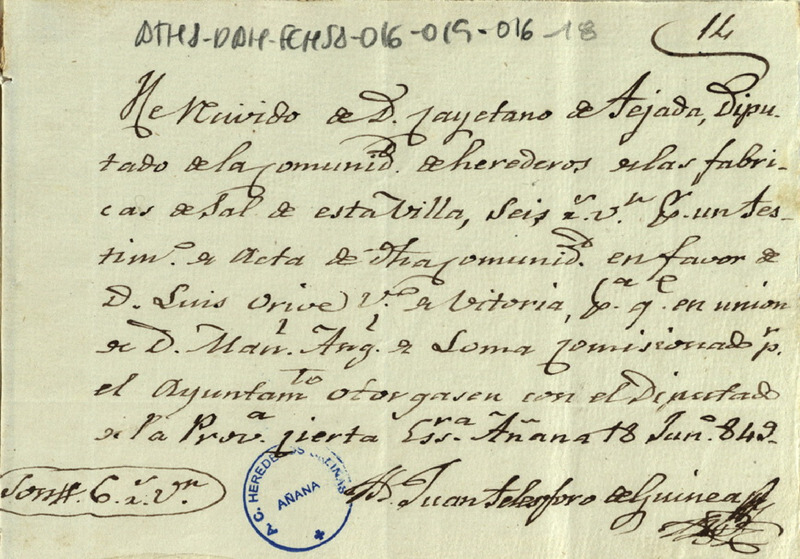 Recibo de 6 reales otorgado por el escribano Juan Telesforo de Guinea, en favor de Cayetano de Tejada como Diputado de la Comunidad de Herederos de las salinas de Añana, por la realización del testimonio de un acta de la expresada Comunidad