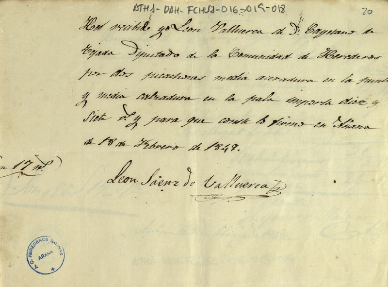 Recibo de 17 reales otorgado por León Sáenz de Valluerca, en favor de Cayetano de Tejada como Diputado de la Comunidad de Herederos de las salinas de Añana, por el suministro de dos picachones de media aceradura en su punta