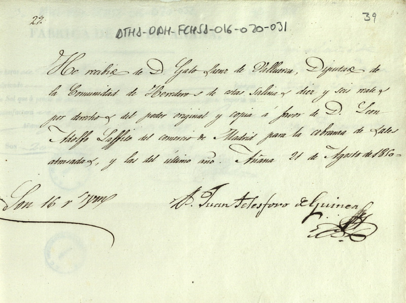 Recibo de 16 reales de vellón otorgado por Juan Telesforo de Guinea, en favor de Galo Sáenz de Valluerca como Diputado de la Comunidad de Herederos de las salinas de Añana, por la realización de la escritura de un poder y su copia en favor de León Adolfo Laffite