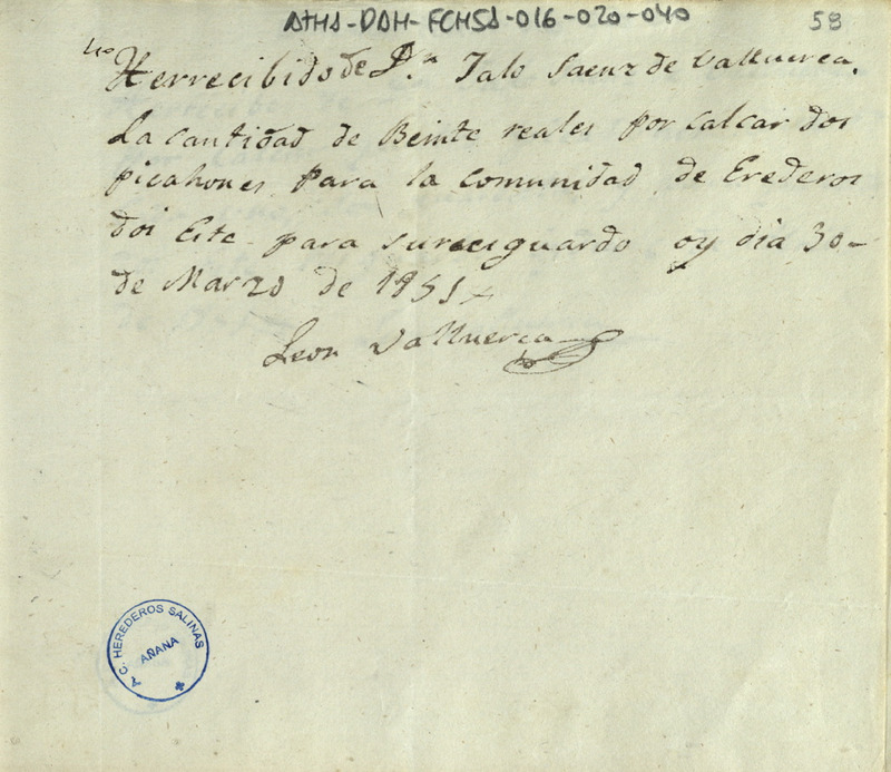 Recibo de 20 reales de vellón otorgado por León Valluerca, en favor de Galo Sáenz de Valluerca Diputado de la Comunidad de Herederos de las salinas de Añana, por calzar dos picachones para la expresada Comunidad
