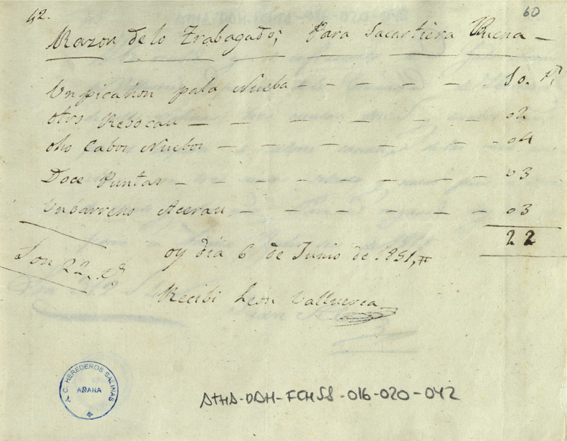 Recibo de 22 reales de vellón otorgado por León Valluerca, por la realización de diversos trabajos y materiales para sacar tierra buena
