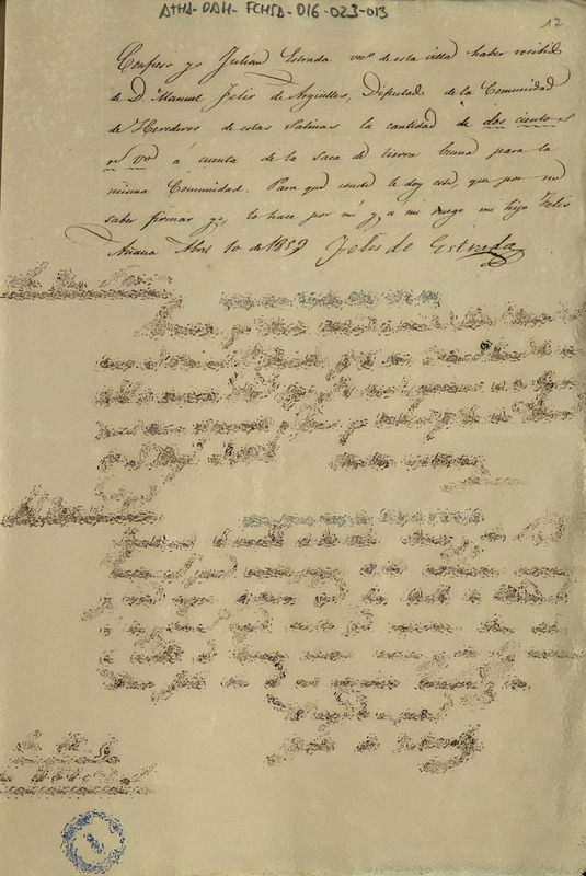 Recibo de 200 reales de vellón otorgado por Julián Estrada, por la saca de tierra buena para la Comunidad de Herederos de las salinas de Añana
