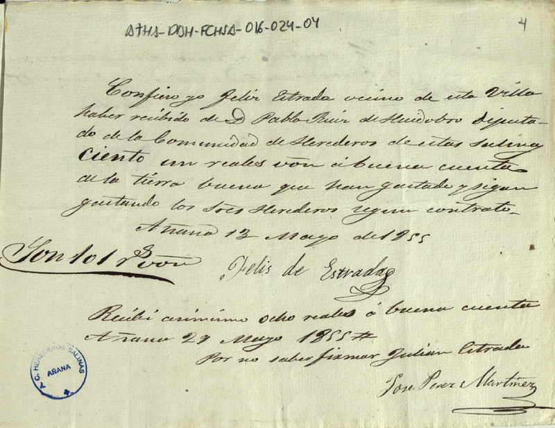 Recibo de 101 reales de vellón otorgado por Félix de Estrada, vecino de la villa de Salinas de Añana, en favor de Pablo de Huidobro como Diputado de la Comunidad de Herederos de las salinas de Añana, por la saca de tierra buena para la expresada Comunidad; otro recibo de 8 reales otorgado por José Pérez Martínez al mismo Diputado por el mismo concepto; y otro recibo de 19 reales otorgado por Julián Ortiz de Villacián