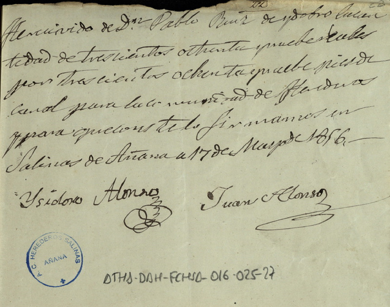 Recibo de 389 reales de vellón otorgado por Juan e Isidoro Alonso, vecinos de Barrio, en favor de Pablo Ruiz de Huidobro como Diputado de la Comunidad de Herederos de las salinas de Añana, por el suministro de 389 piés de canal, a razón de un real cada uno