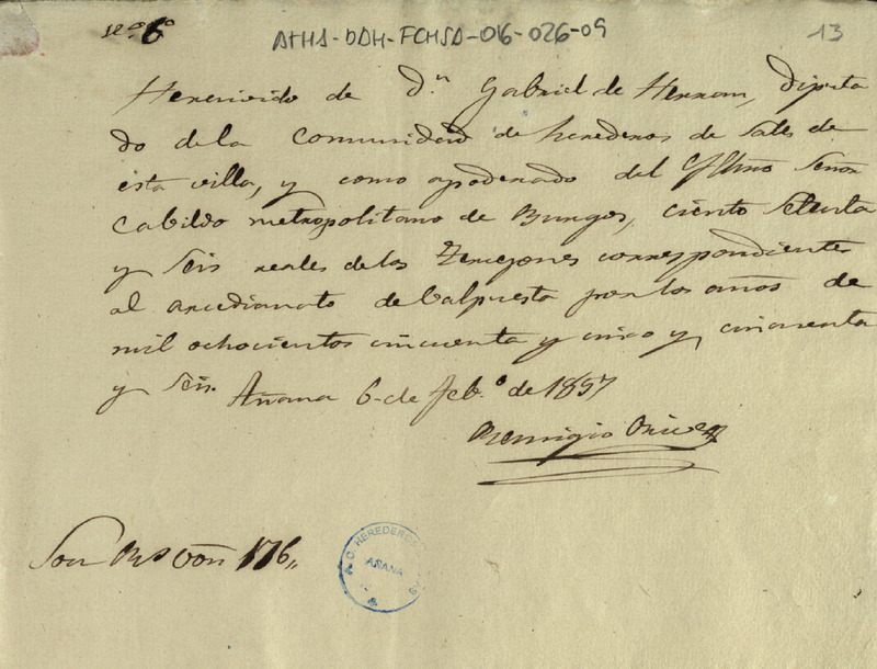 Recibo de 176 reales de vellón otorgado por Remigio de Orive, en favor de Gabriel de Herrán como Diputado de la Comunidad de Herederos de las salinas de Añana, por el tercejón correspondiente a los años de 1855 y 1856, que cobra el Arcedianato de Valpuesta