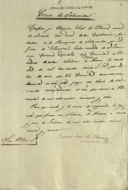 Recibo de 1.320 reales de vellón otorgado por Ramiro Leal de Ibarra, dueño de la capellanía fundada por Juan de Echaurren en la iglesia parroquial de Salmantón, y vecino de Saracho, en favor de Francisco de Corcuera, como Diputado de la Comunidad de Herederos de las salinas de Añana, por los réditos correspondientes al año de 1858 de un censo que corría en contra de la expresada Comunidad, y favor de dicha capellanía