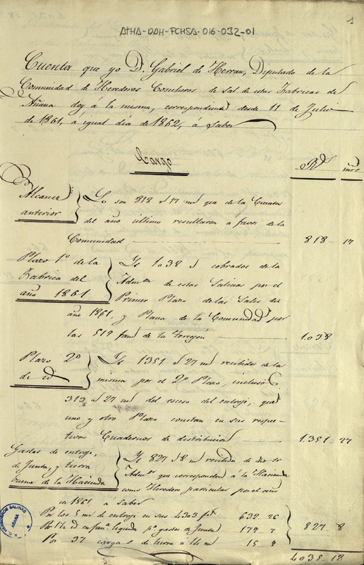 Cuenta otorgada por el Diputado de la Comunidad de Herederos de las salinas de Añana Gabriel de Herrán, comenzada el 11 de julio de 1861 y finalizada el mismo día de 1862, resultando un alcance a favor de la expresada Comunidad de 1.200 reales y 23 maravedíes