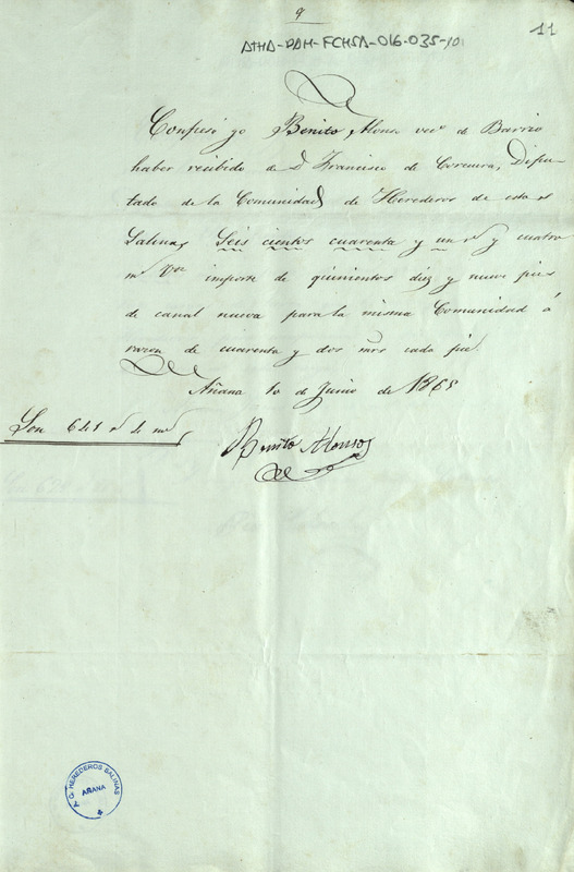 Recibo de 641 reales y 4 maravedíes otorgado por Benito Alonso, por el suministro de 519 pies de canal para la Comunidad de Herederos de las salinas de Añana