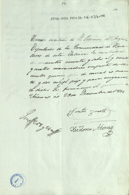 Recibo de 268 reales y 24 maravedíes otorgado por Santos Zárate e Isidoro Alonso, por 215 pies de canal suministrados a la Comunidad de Herederos de las salinas de Añana