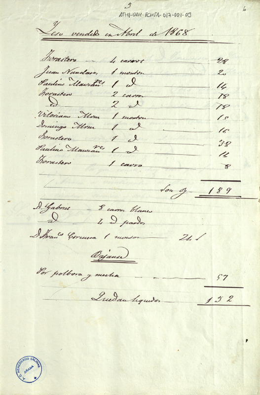 Cuenta de la Comunidad de Herederos de las salinas de Añana, del yeso vendido en abril de 1868