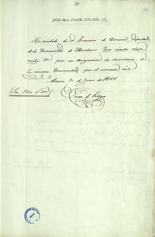 Recibo de 320 reales de vellón otorgado por Juan de Ortega, en favor de Francisco de Corcuera como Diputado de la Comunidad de Herederos de las salinas de Añana, por su salario como secretario de la expresada Comunidad correspondiente al presente año de 1868
