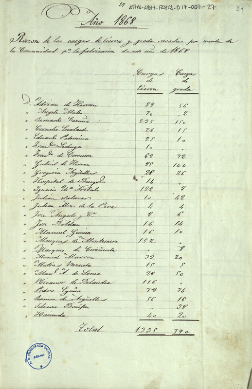 Cuenta e inventario de las cargas de tierra y greda sacadas por los Herederos de las salinas de Añana para el año de 1868, arrojando un total de 1.335 cargas de tierra y 790 de greda