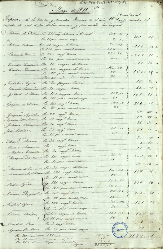 Lista del repartimiento entre los Herederos de las salinas de Añana, para cubrir las cargas de tierra y pies de canal del año de 1871 ascendiendo a un total de 2.432,01 reales