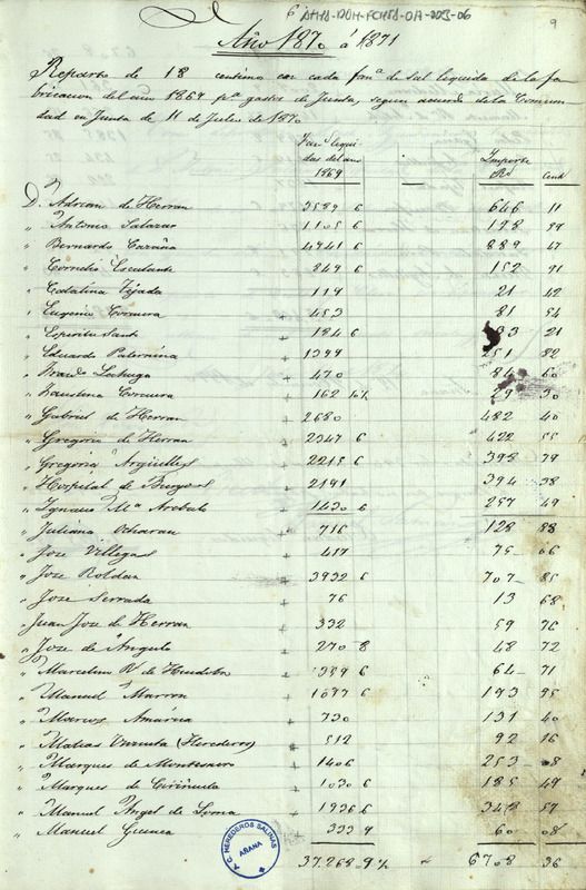 Lista del repartimiento de 18 céntimos por fanega de sal fabricada en 1869, entre los Herederos de las salinas de Añana, para cubrir los gastos de Junta según acuerdo de 11 de julio de 1870, ascendiendo a un total de 9.589, 95 reales