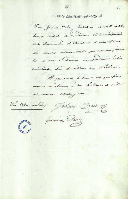 Recibo de 280 reales de vellón otorgado por Julián y Jerónimo Díaz, en favor de Antonio Salazar como Diputado de la Comunidad de Herederos de las salinas de Añana, por sus jornales como guardas cañeros y celadores del Valle Salado de Añana del mes de febrero de 1871