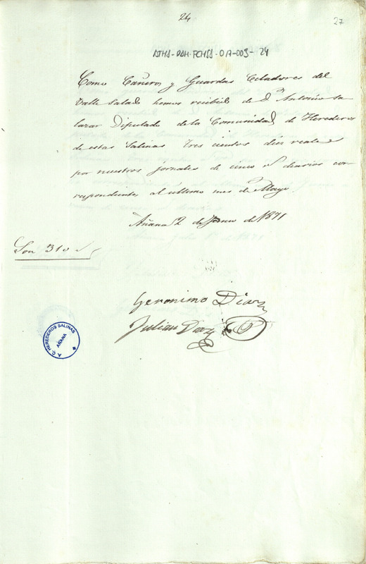 Recibo de 310 reales de vellón otorgado por Julián y Jerónimo Díaz, en favor de Antonio Salazar como Diputado de la Comunidad de Herederos de las salinas de Añana, por sus jornales como guardas cañeros y celadores del Valle Salado de Añana del mes de mayo de 1871, a razón de 5 reales diarios