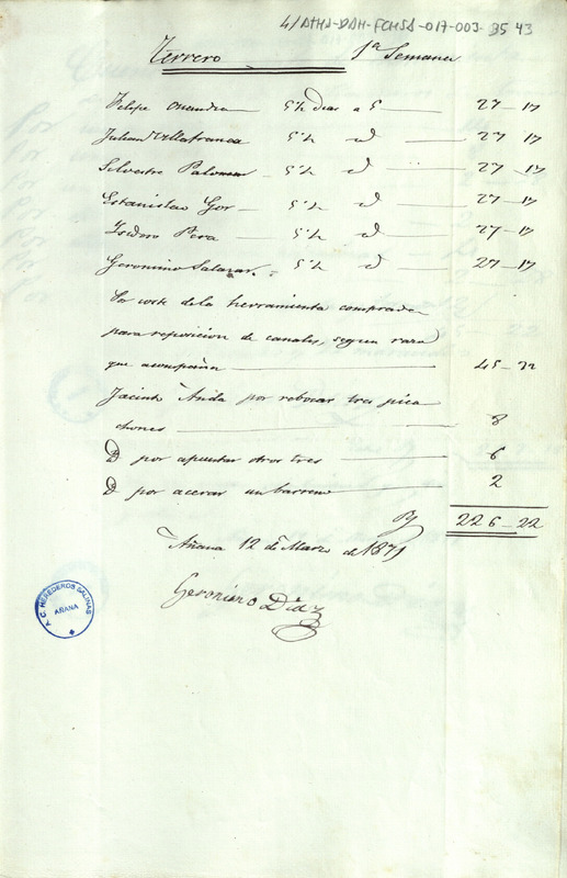 Cuenta de gastos de la primera semana de marzo de 1871 de saca de tierra buena en el Terrero de Salinas de Añana, realizada por Jerónimo Díaz, con expresión de los jornaleros y sus jornadas de trabajo, ascendiendo a un total de 226,22 reales