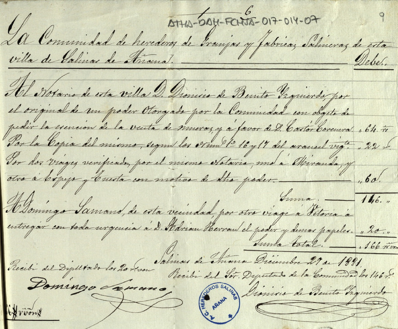 Recibo de 806 reales otorgado por los guardas del Valle Salado de Añana, en favor de Joaquín de Herrán como Diputado de la Comunidad de Herederos de las salinas de Añana, por sus jornales durante el mes de agosto de 1871