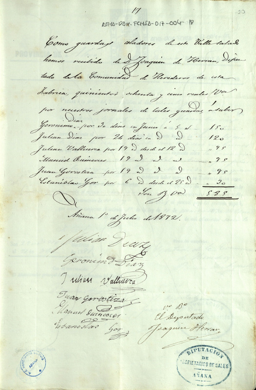 Recibo de 585 reales otorgado por los guardas cañeros y celadores del Valle Salado de Añana, Juan Valluerca, Juan Gorostiza, Manuel Quincoces, Estanislao Gor y Jerónimo y Julián Díaz, en favor de Joaquín de Herrán como Diputado de la Comunidad de Herederos de las salinas de Añana, por sus jornales durante el mes de junio de 1872