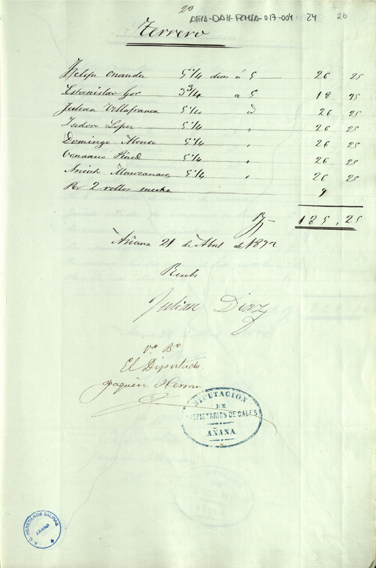 Recibo de 185 reales con 25 maravedíes otorgado por Julián Díaz, en favor de Joaquín de Herrán como Diputado de la Comunidad de Herederos de las salinas de Añana, por jornales de los peones que realizaron la saca de tierra buena en el Terrero de la citada villa en la 3ª semana de abril de 1872, con expresión de cada uno de los citados peones y sus jornadas