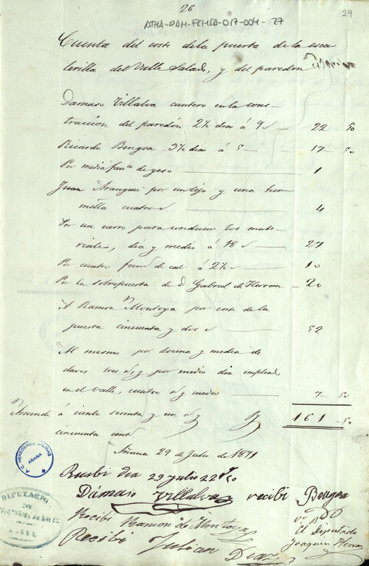 Cuenta y recibo de 161 reales con 50 maravedíes otorgado por Julián Díaz, Dámaso Villalba, Ricardo Bengoa y Ramón Montoya, en favor de Joaquín de Herrán como Diputado de la Comunidad de Herederos de las salinas de Añana, en concepto del coste de la puerta de la escalerilla del Valle Salado de Añana