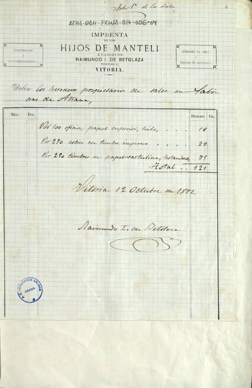 Recibo de 121 reales otorgado por Raimundo Ibáñez de Betolaza, encargado de la Imprenta de los Hijos de Manteli, en favor de la Comunidad de Herederos de las salinas de Añana, por la impresión de 100 oficios, 250 sobres con timbre y 250 timbres en papel cartulina
