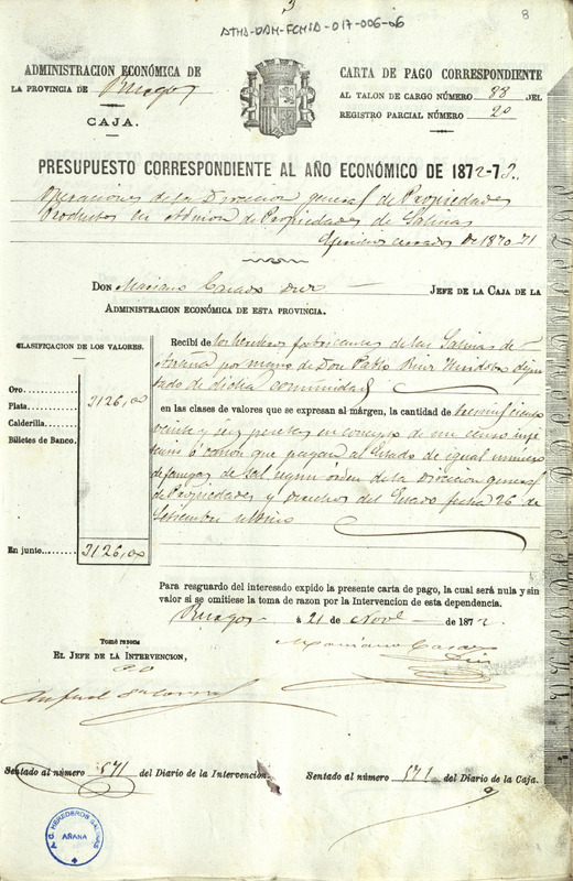 Carta de pago de 3.126 pesetas otorgado por Mariano Casado Díez, Jefe de la Caja de la Administración Económica de la provincia de Burgos, en favor de Pablo Ruiz de Huidobro como Diputado de la Comunidad de Herederos de las salinas de Añana, por el canon correspondiente a los ejercicios de 1870 y 71, que paga al Estado la expresada Comunidad por el mismo número de fanegas de sal