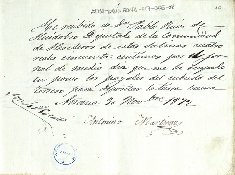 Recibo de 4 reales y medio otorgado por Antonio Martínez, por el medio día ocupado en poner los poyales del Terrero en Salinas de Añana