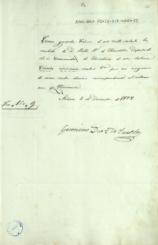 Recibo de 150 reales otorgado por Jerónimo Díaz de Tuesta, por su asignación como guarda cañero correspondiente al mes de noviembre de 1872