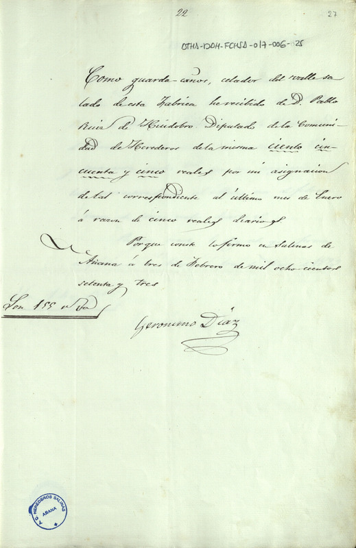 Recibo de 155 reales otorgado por Jerónimo Díaz de Tuesta, por su asignación como guarda cañero correspondiente al mes de enero de 1873