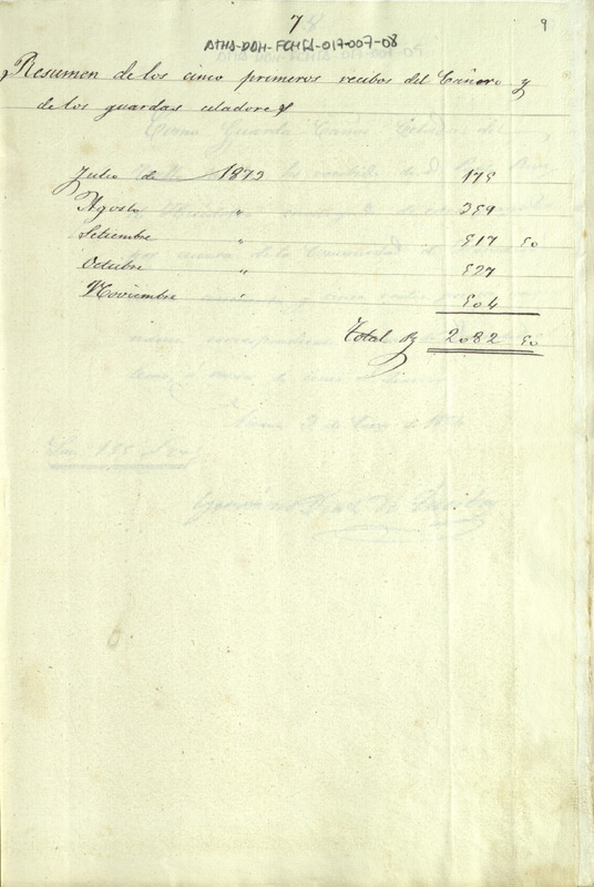 Resumen de los recibos entregados por los guarda caños y celadores del Valle Salado de Añana correspondientes a los meses entre julio y noviembre de 1873, ambos inclusive