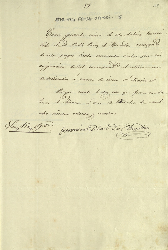 Recibo de 150 reales otorgado por Jerónimo Díaz de Tuesta, en favor de Pablo Ruiz de Huidobro como Diputado de la Comunidad de Herederos de las salinas de Añana, por su asignación como guarda cañero celador del Valle Salado de Añana, correspondiente al mes de septiembre de 1874