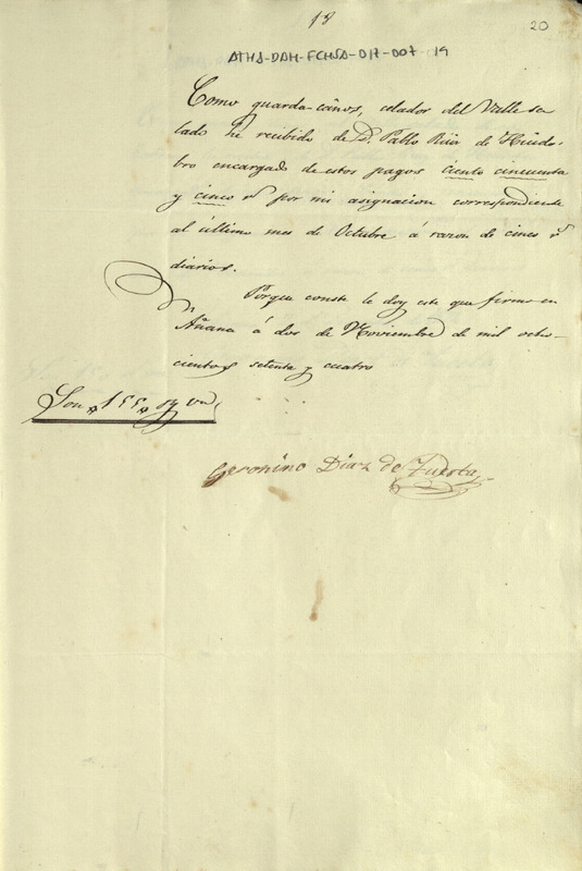 Recibo de 155 reales otorgado por Jerónimo Díaz de Tuesta, por su asignación como guarda cañero del mes de octubre de 1874