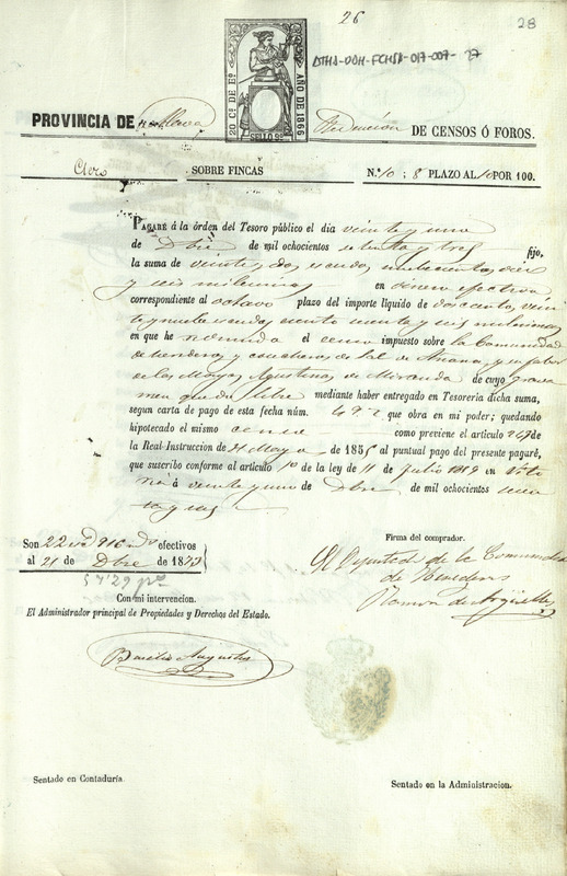 Carta de obligación de pago de 22 escudos y 916 milésimas, es decir 57,29 pesetas, otorgada por Ramón de Argüelles, como Diputado de la Comunidad de Herederos de las salinas de Añana, como 8º pago de la redención de un censo que corre en favor de las monjas Agustinas de Miranda de Ebro, que debía hacerse efectiva el 21 de diciembre de 1873