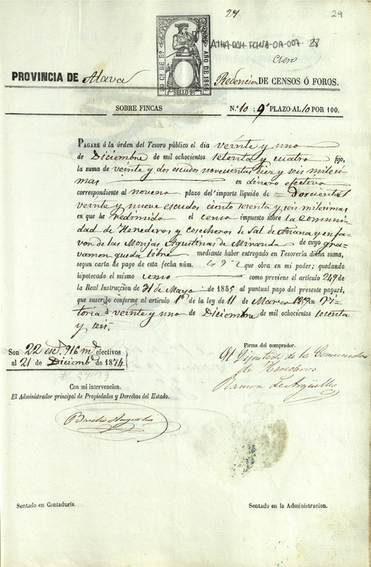 Carta de obligación de pago de 22 escudos y 916 milésimas, es decir 57,29 pesetas, otorgada por Ramón de Argüelles, como Diputado de la Comunidad de Herederos de las salinas de Añana, como 9º pago de la redención de un censo que corre en favor de las monjas Agustinas de Miranda de Ebro, que debía hacerse efectivo el 21 de diciembre de 1874
