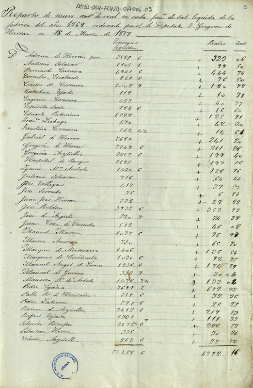 Lista del repartimiento de 9 céntimos de real en cada fanega de sal líquida de la fábrica de 1869, ordenado por Gregorio de Herrán, Diputado de la Comunidad de Herederos de las salinas de Añana, ascendiendo a un total de 4.992,16 reales