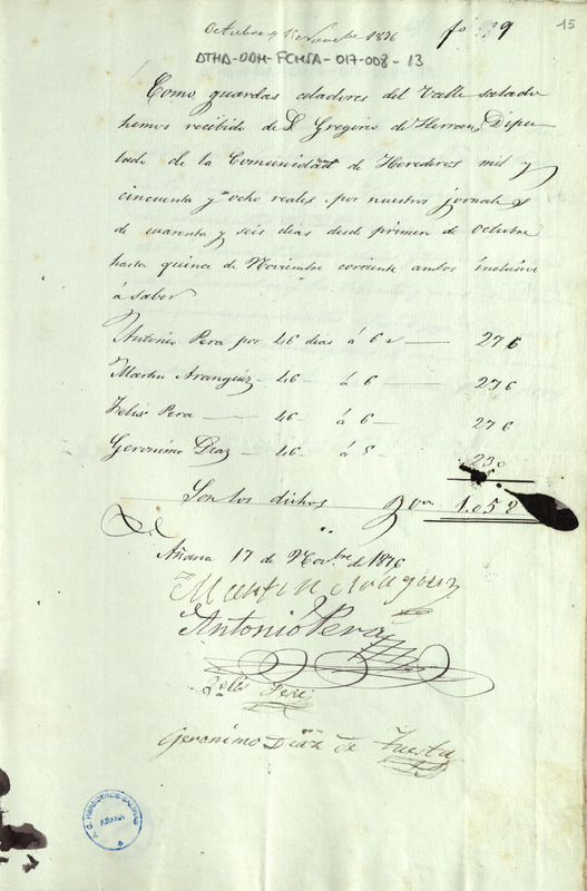 Recibo de 1.058 reales otorgado por los guarda caños y celadores del Valle Salado de Añana, Antonio Pera, Martín Aránguiz, Félix Pera y Jerónimo Díaz de Tuesta, en favor de Gregorio de Herrán como Diputado de la Comunidad de Herederos de las salinas de Añana, por su asignación desde el 1º de octubre hasta el 15 noviembre de 1876