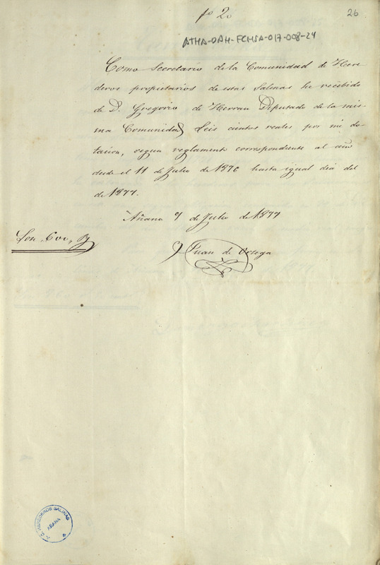 Recibo de 600 reales otorgado por Juan de Ortega, por su asignación como secretario de la Comunidad de Herederos de las salinas de Añana, en el período 1876 - 1877