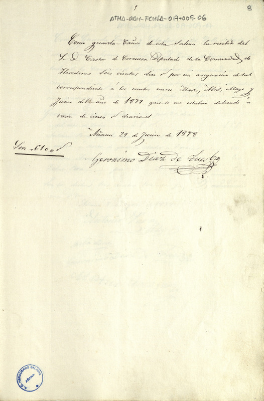 Recibo de 610 reales de vellón otorgado por Jerónimo Díaz de Tuesta, en favor de Cástor de Corcuera, como Diputado de la Comunidad de Herederos de las salinas de Añana, por su asignación como guarda cañero del Valle Salado de Añana, por los meses atrasados desde marzo a junio de 1877