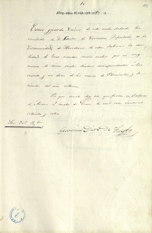 Recibo de 305 reales de vellón otorgado por Jerónimo Díaz de Tuesta, en favor de Cástor de Corcuera, como Diputado de la Comunidad de Herederos de las salinas de Añana, por su asignación como guarda cañero del Valle Salado de Añana, por los meses de noviembre y diciembre de 1877