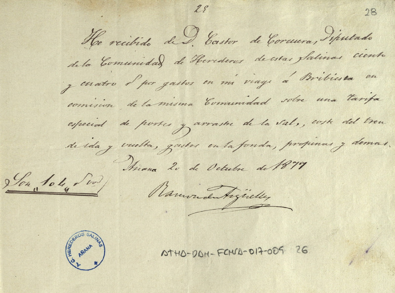 Recibo de 104 reales de vellón otorgado por Ramón de Argüelles, en favor de Cástor de Corcuera, como Diputado de la Comunidad de Herederos de las salinas de Añana, por los gastos de viaje a Bribiesca en representación de la expresada Comunidad para conseguir una tarifa especial para portes y arrastre de sal