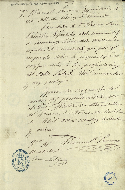 Recibo de 1.052 pesetas otorgado por Manuel Samano como depositario del Ayuntamiento de Salinas de Añana y con el visto bueno de su alcalde, Ramón de Argüelles, en favor de Ramón Ruiz de Huidobro, como Diputado de la Comunidad de Herederos de las salinas de Añana, por el impuesto sobre la propiedad que corresponde a los propietarios del Valle Salado de Añana