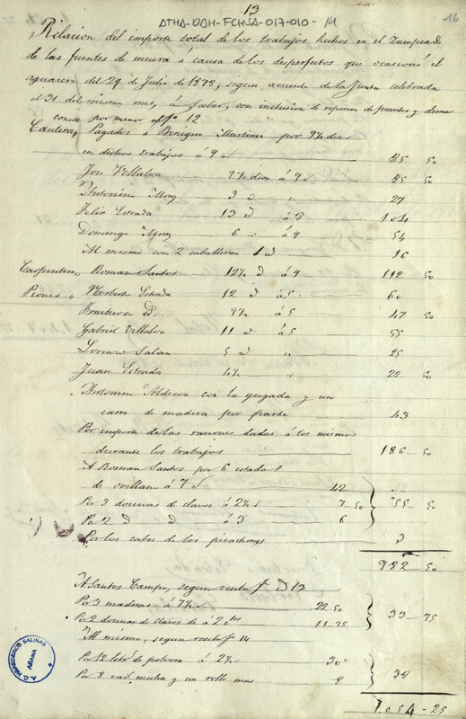 Recibo de 1.409,25 reales otorgado por diversos peones, por los trabajos de zampeado realizados en las fuentes de muera de Salinas de Añana, según acuerdo de la Junta de la Comunidad de Herederos de las salinas de Añana de 29 de julio de 1878, por los desperfectos ocasionados por un aguacero