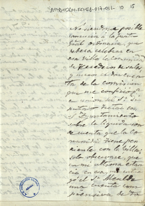Comunicación de Adrián de Herrán dirigida al Diputado de la Comunidad de Herederos de las salinas de Añana, sobre la deuda que acumulaba dicha Comunidad con su Ayuntamiento