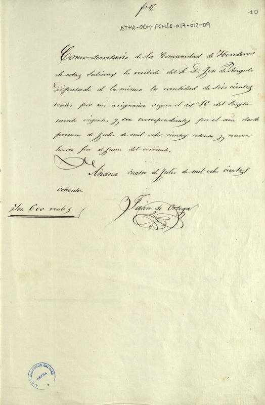 Recibo de 600 reales otorgado por Juan de Ortega, en favor de José de Angulo como Diputado de la Comunidad de Herederos de las salinas de Añana, por su asignación como secretario de la expresada Comunidad, desde el 1 de julio de 1879 hasta fin de junio del corriente