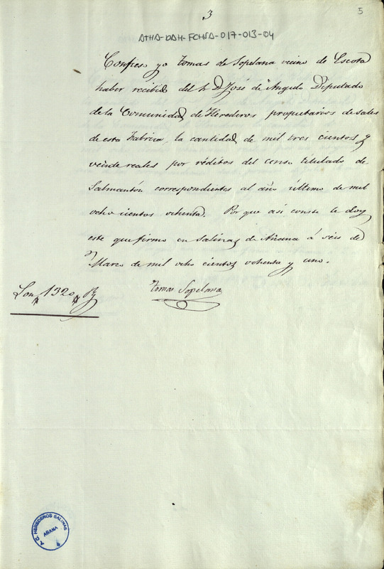 Recibo de 1.320 reales otorgado por Tomás de Sopelana, por los réditos del censo titulado de Salmantón correspondientes al año 1880