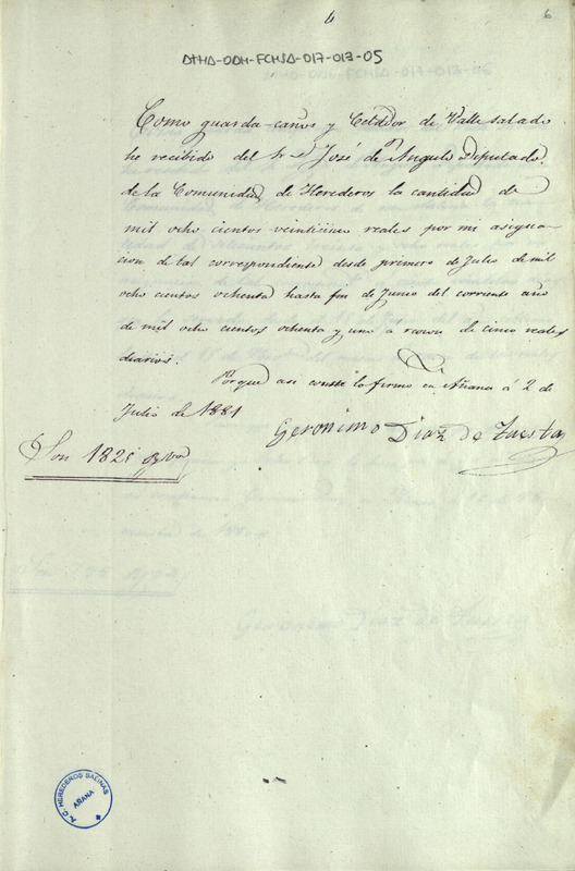 Recibo de 1.825 reales otorgado por Jerónimo Díaz de Tuesta, por su asignación como guarda-caños y celador del Valle Salado de Añana, desde 1º de julio de 1880 hasta fin de junio del corriente