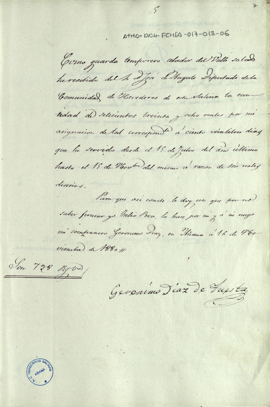 Recibo de 738 reales otorgado por Félix Pera y en su nombre firmado por Jerónimo Díaz de Tuesta, en favor de José de Angulo como Diputado de la Comunidad de Herederos de las salinas de Añana, por su asignación como guarda temporero celador del Valle Salado de Añana, desde 15 de julio hasta el 15 de noviembre de 1880