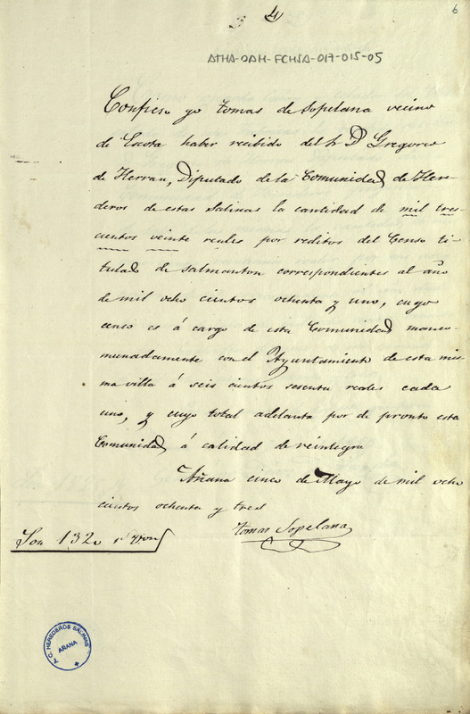 Recibo de 1.320 reales otorgado por Tomás de Sopelana, en favor de Gregorio de Herrán como Diputado de la Comunidad de Herederos de las salinas de Añana, por los réditos del censo de Salmantón correspondientes al año de 1881, que corre mancomunadamente contra la expresada Comunidad y el Ayuntamiento de su villa